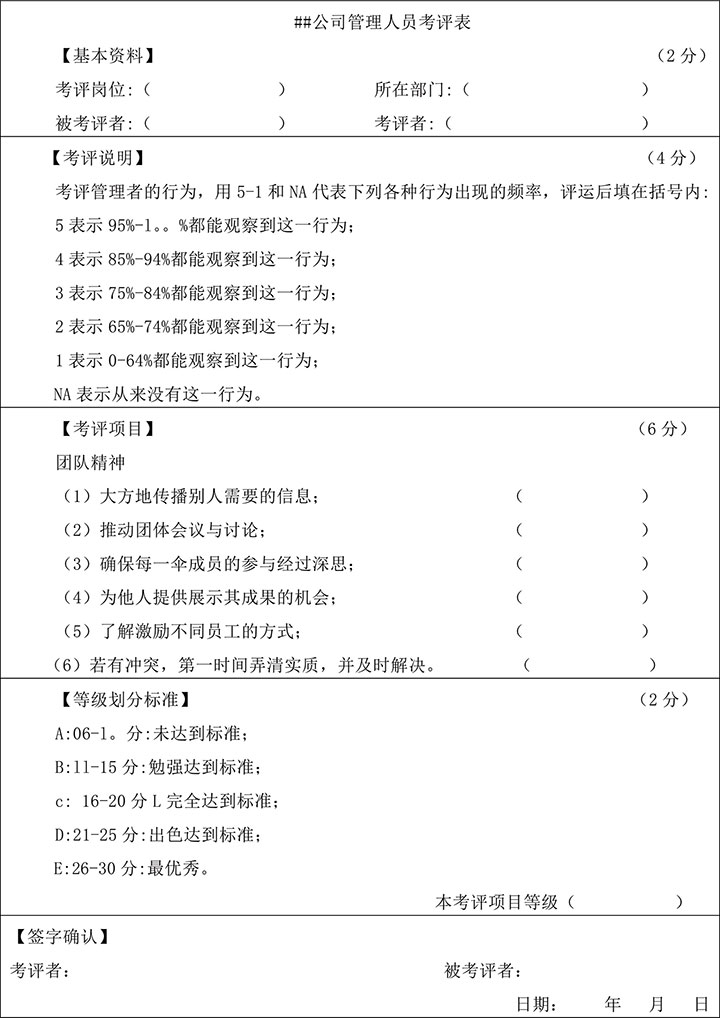 (2)运用行为观察量表法就案例中管理人员的"团队精神"指标设计考评表。