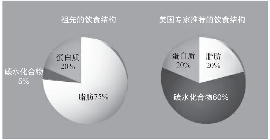 闪回到狩猎人和采集者的时刻,他们的大脑和你的大脑并没有太大的不同,两者都进化出寻找富含脂肪和糖的食物的偏好,毕竟,这是一种生存的机制。问题是作为现代人,你要狩猎的时间很短,因为你生活在一个物质丰富的时代,而且更容易找到加工过的脂肪和糖。穴居人则可能要花费很长时间寻找,而且只能碰巧在动物身上得到脂肪,从当季的植物和浆果中获得天然的糖分。因此,你们大脑的偏好相似,但是营养来源却并不相同。图1-1描绘了我们和祖先们在饮食上的主要区别: