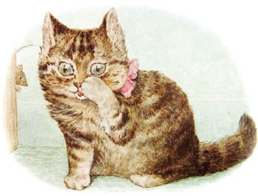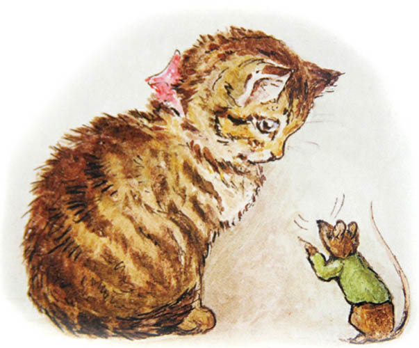 这是一只躲在碗柜后面的老鼠,他探头探脑地向外偷看,和娃娃小姐开着玩笑。他并不怕一只小猫。