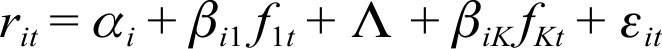 这是证券定价的核心公式。 在该公式中 r it 为 i 证券在 t 期的收益率, f Kt 为 K 因子在 t 期的收益率, β iK 为 i 证券对 K 因子的因子暴露, α i 为 i 证券的特殊因子, ε it 为 i 证券在 t 期的随机误差项。