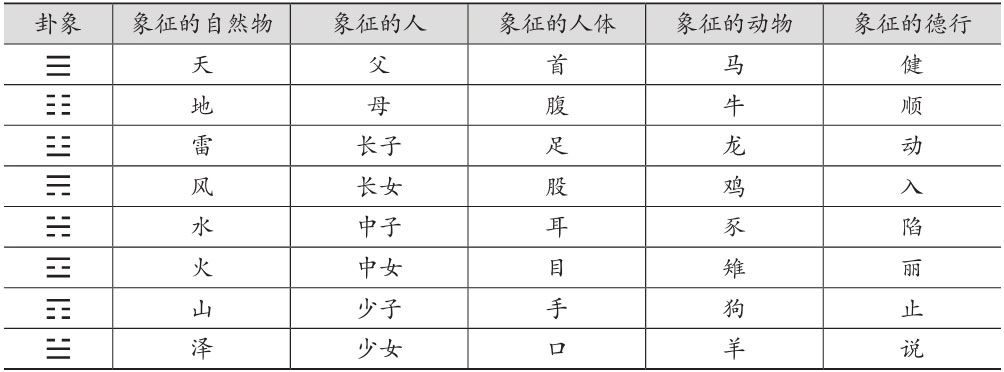 这八个卦象各有众多的象征意义,其基本的象征意义如下表所示:
