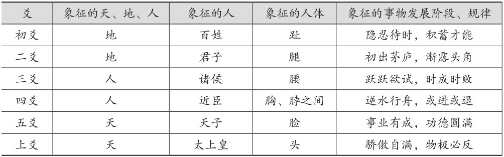 每一卦中的六爻也分别象征众多不同的意义,其基本的象征意义如下表所示: