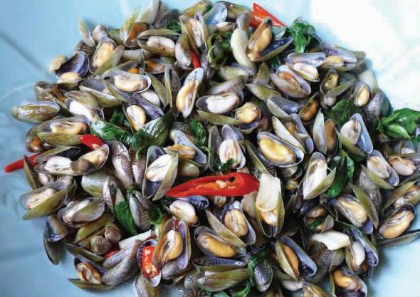 潮式炒鲜薄壳除了放蒜头、沙茶和辣椒,一定要加入一种叫金不换或九层塔的香料。(照片提供:厦门嘉和潮苑大酒楼)