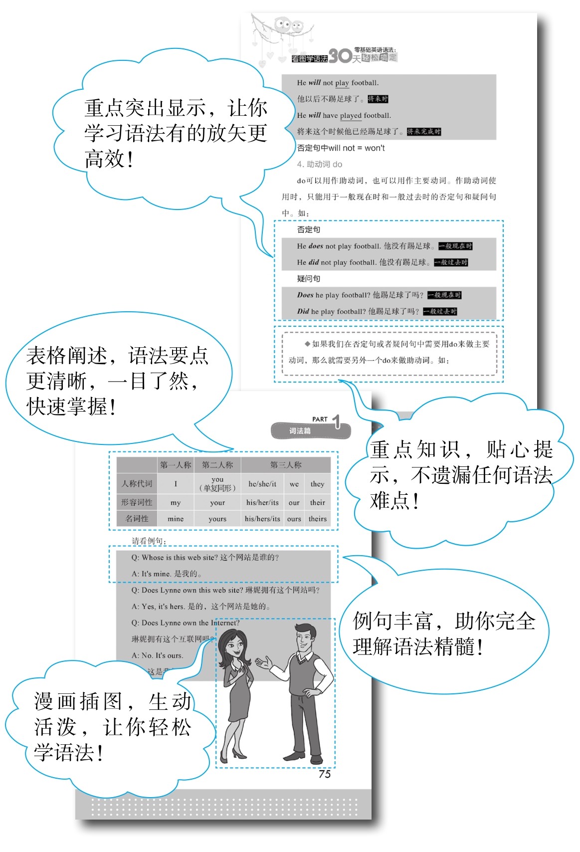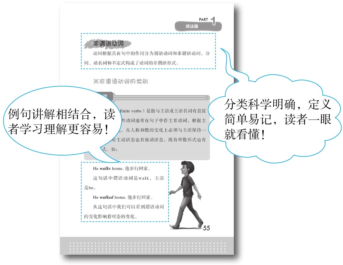 一说到语法,很多人都望而生畏,谈“语法”而色变,语法成为了很多英语学习者难以攻克的难关之一。但是,英语语法是学习英语的骨架,是英语王国的支柱,没有语法的支撑,英语这座城堡就建不起来,也就算不上城堡。在英语世界里,语法又可以说是英语的规则,因为无论是单词还是词组,只有按照一定的规则排列才能组成正确的句子,才能算是正确的语言。所以,要想学好英语,必须学好语法。其实,语法并没有大家想象中那么难学,只要有一本优秀的书籍做指导,相信大家能很快攻克这一难关。为了帮助大家尽快掌握这些重要的“规则”,我们特意编写了本书。
