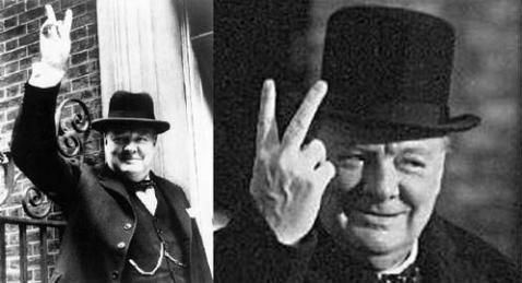 事实上,这个手势是有讲究的:手心面对观众,表示“胜利”“和平”;而手背面对观众,则表示“滚蛋”。图中丘吉尔显然深谙此动作的意思。