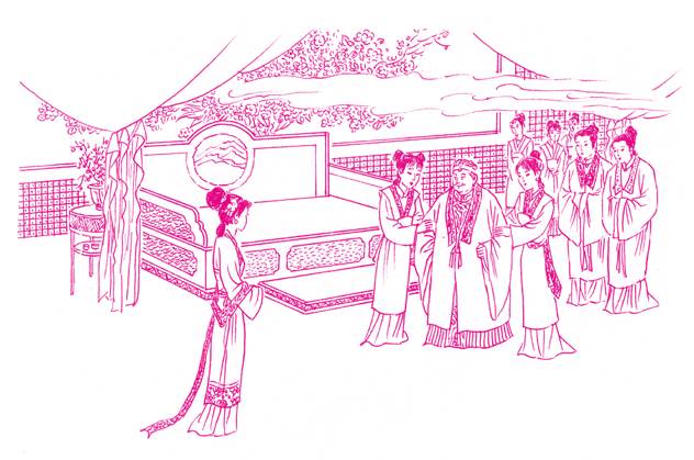 黛玉刚走进房内,只见两个人搀着一位鬓发如银的老妇人迎上来。黛玉知是贾母,来不及拜见,就被外祖母一把搂入怀中,“心肝儿肉”叫着大哭起来。当下周围的人也都掩面哭泣起来,黛玉也哭个不住。一时众人慢慢解劝住了,黛玉方拜见了外祖母,又一一拜见过众人。过了一会儿,只见三个奶 嬷嬷 和五六个丫鬟,簇拥着三个姊妹来了。第一个肌肤微丰,鼻腻鹅脂,温柔可亲;第二个长挑身材,鸭蛋脸面,俊眼修眉;第三个年龄尚小。她们是贾府的三位小姐:迎春、探春和惜春。黛玉忙起身迎上来见礼。丫鬟们斟上茶来,大家又问了问黛玉之母得病及去世的情况。贾母又不免伤感起来,说:“我这些儿女中,最疼的就是你母亲,她却先我而去了,连面也不能一见,如今见了你,我怎能不伤心?”说着,又把黛玉搂在怀里哭了起来。在众人的宽慰下,她们方略略止住。众人见黛玉年龄虽小,但言谈举止不俗,身体也有些虚弱,便又问起她吃药的情况。