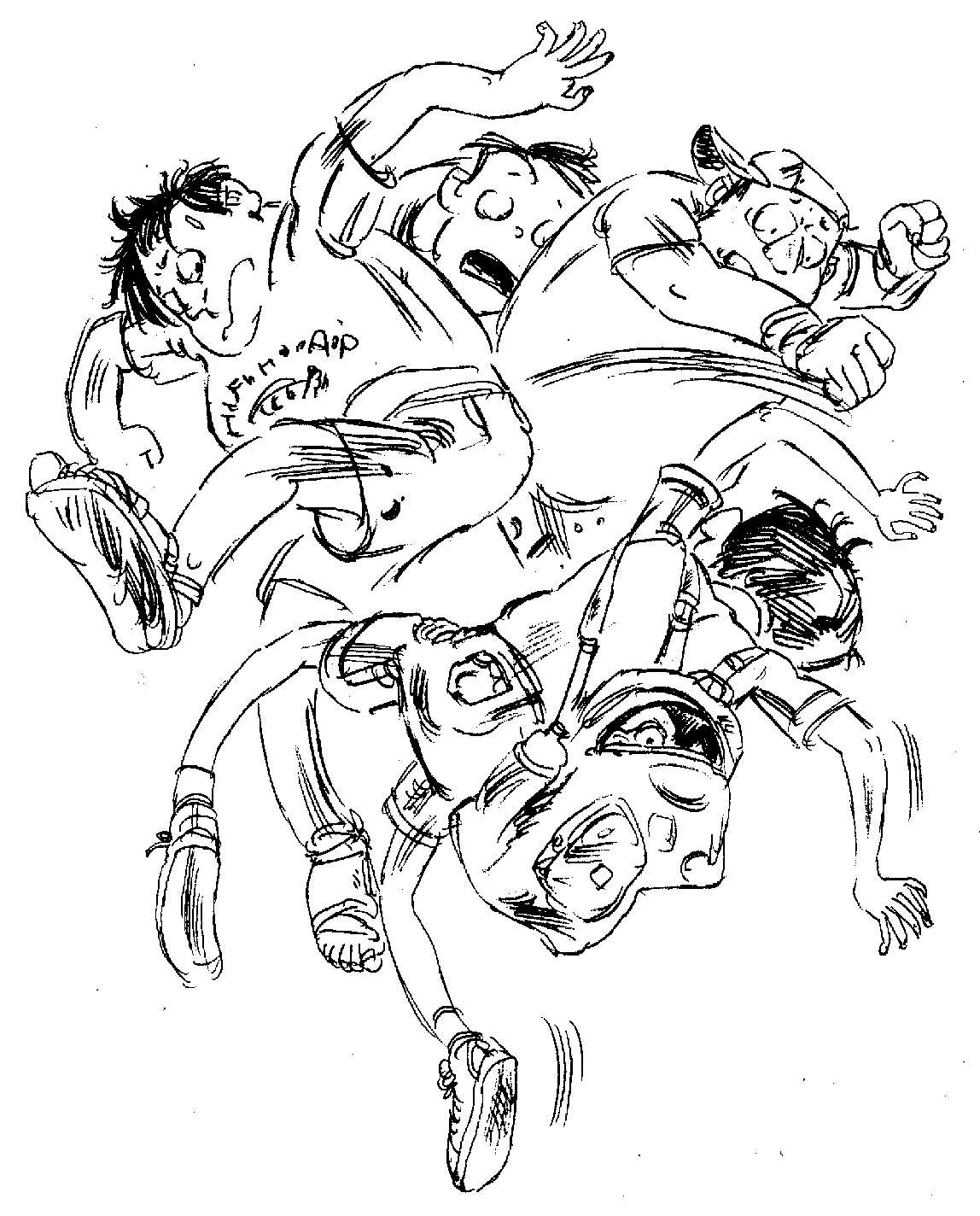 我下意识地捂了一下口袋,里面装着妈妈给我的午餐钱。我可不想中午挨饿,转身要跑,但是我的身后又冒出了两个少年,他们一个身上穿着满是洞洞的衣服,一个剃着光头,一看就不是善类。他们是一伙的,我被包围了!