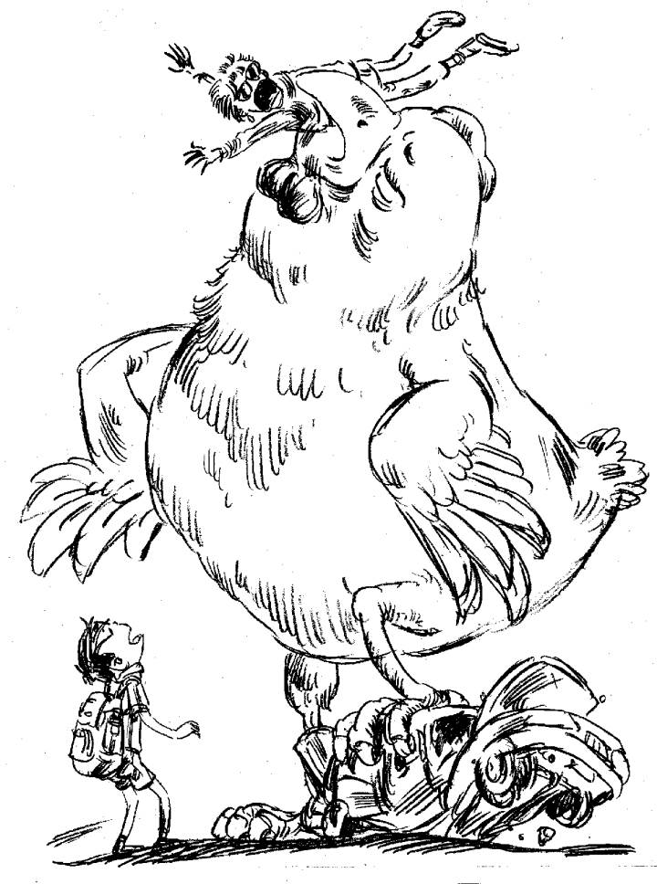 我也顺势爬了起来,仰头看,天哪,芦花大母鸡已经长得和路边的杨树一样高了。它超大的翅膀一扇,地上立刻形成一小股龙卷风,路边的汽车被那风一刮,都倒退了几米。