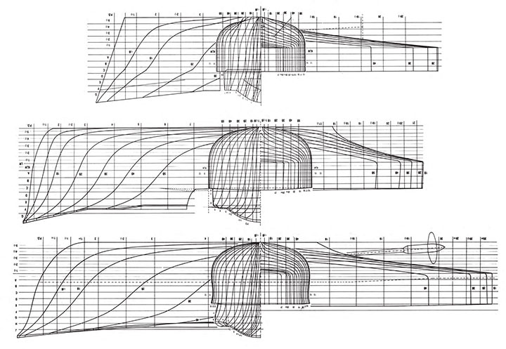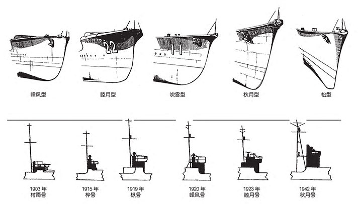 日本海军驱逐舰中最具代表性的吹雪型、阳炎型和松型(从上至下)的剖面图对比。