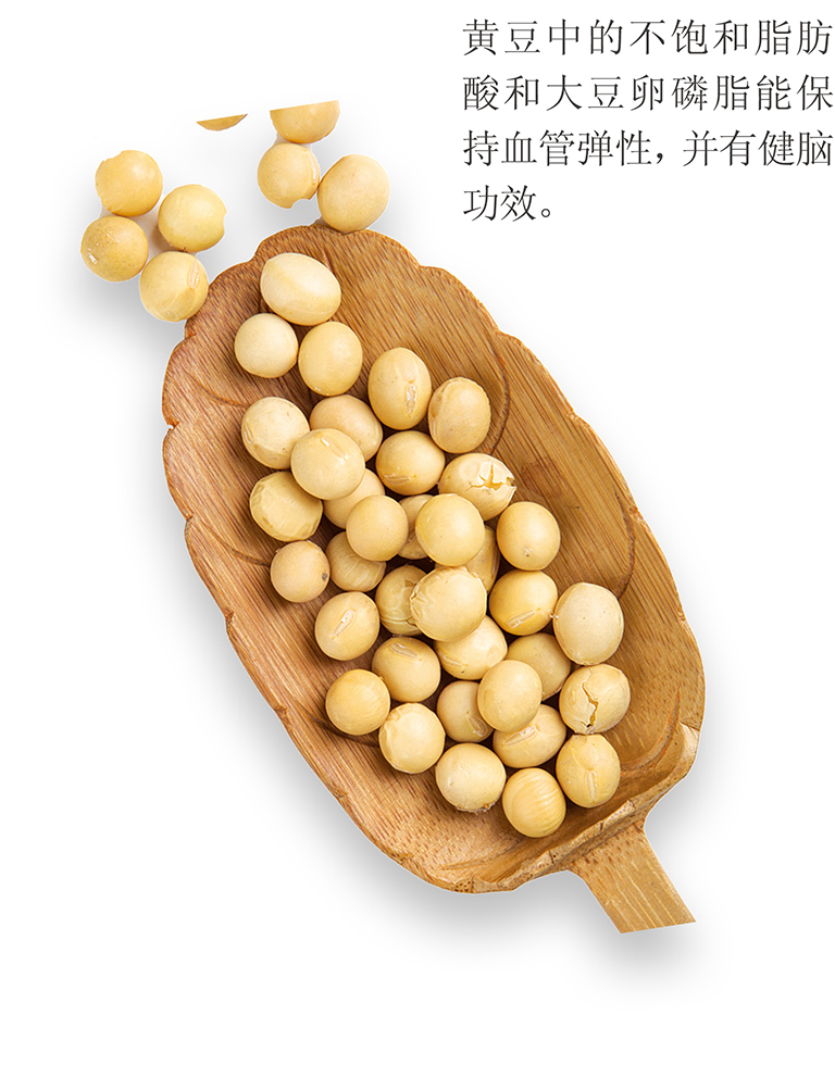 黄豆中的不饱和脂肪酸和大豆卵磷脂能保持血管弹性,并有健脑功效。