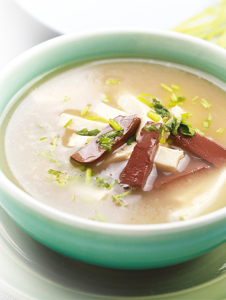 鸭血豆腐汤:鸭血250克,豆腐300克。盐、高汤、酱油、香油、香菜末各适量。将鸭血和豆腐洗净切成条,分别放入沸水汆一下。锅置火上,倒入高汤750毫升烧沸,放鸭血块、豆腐块,煮至豆腐块漂起,加入盐、酱油、香菜末,淋入香油即可。