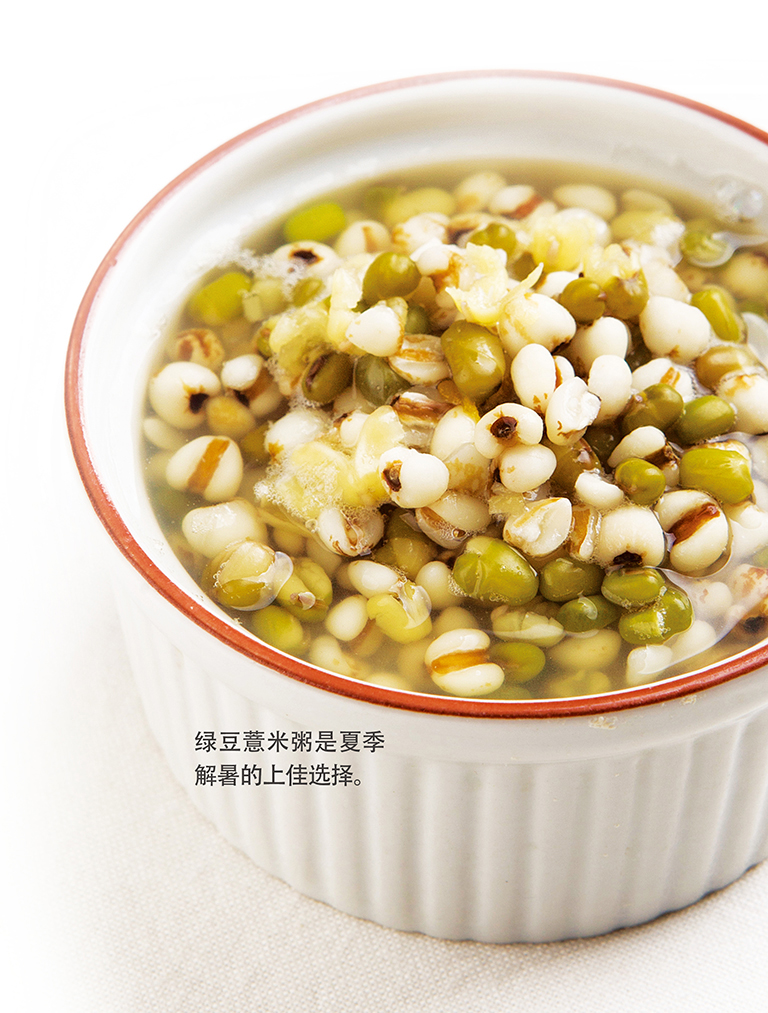 绿豆薏米粥:绿豆150克,薏米60克,冰糖适量。绿豆、薏米洗净。锅中注入清水适量,加入绿豆、薏米,小火煮至烂熟,加入冰糖调味即成。