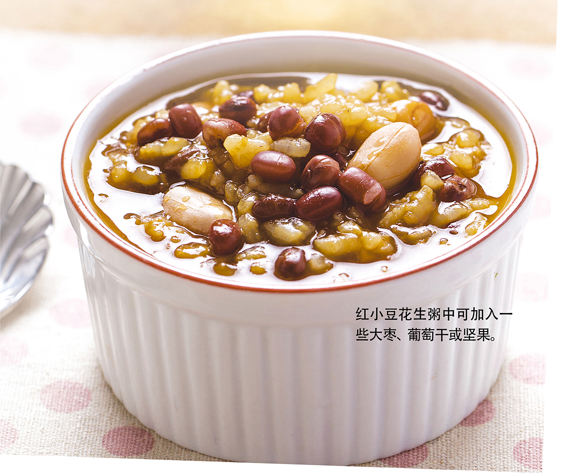 红小豆花生粥:红小豆100克,花生50克,粳米200克,陈皮、红糖各适量。将陈皮、红小豆、花生分别洗净入锅,注入适量清水,烧沸约10分钟后再将粳米洗净加入,用小火慢慢熬煮,待熟时加红糖调味即可。