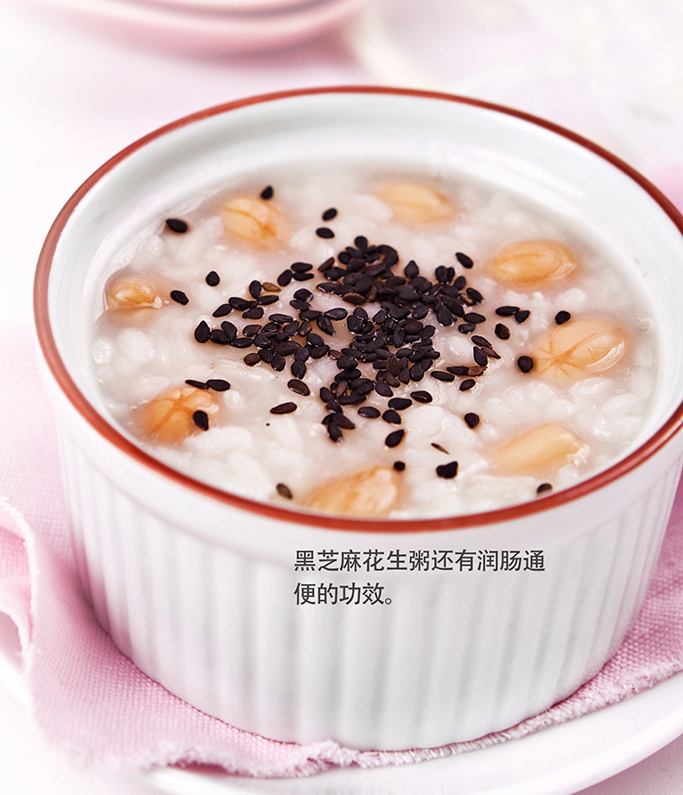 黑芝麻花生粥:黑芝麻30克,粳米150克,花生50克。黑芝麻炒熟备用。粳米、花生放入锅内,加适量清水,熬煮至八成熟时放入黑芝麻,同煮成粥。