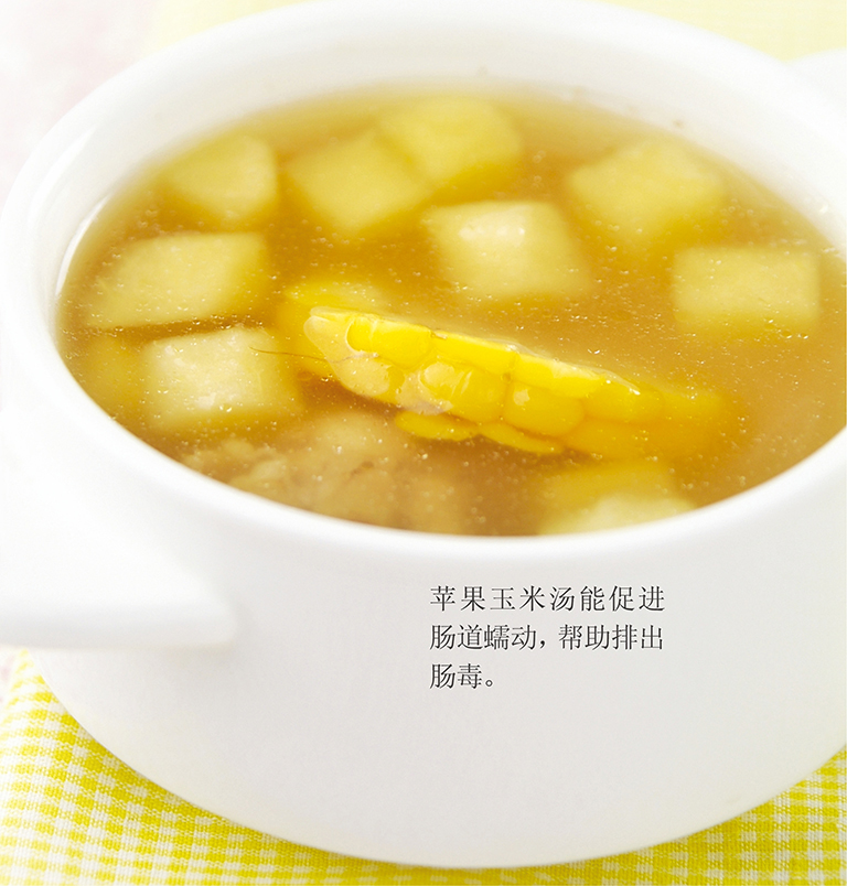 苹果玉米汤能促进肠道蠕动,帮助排出肠毒。