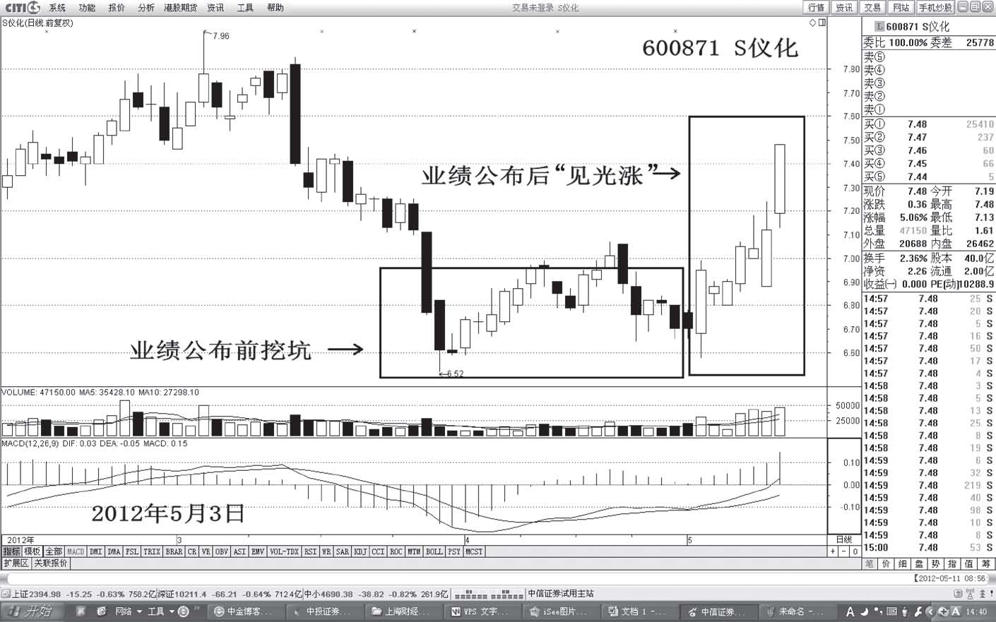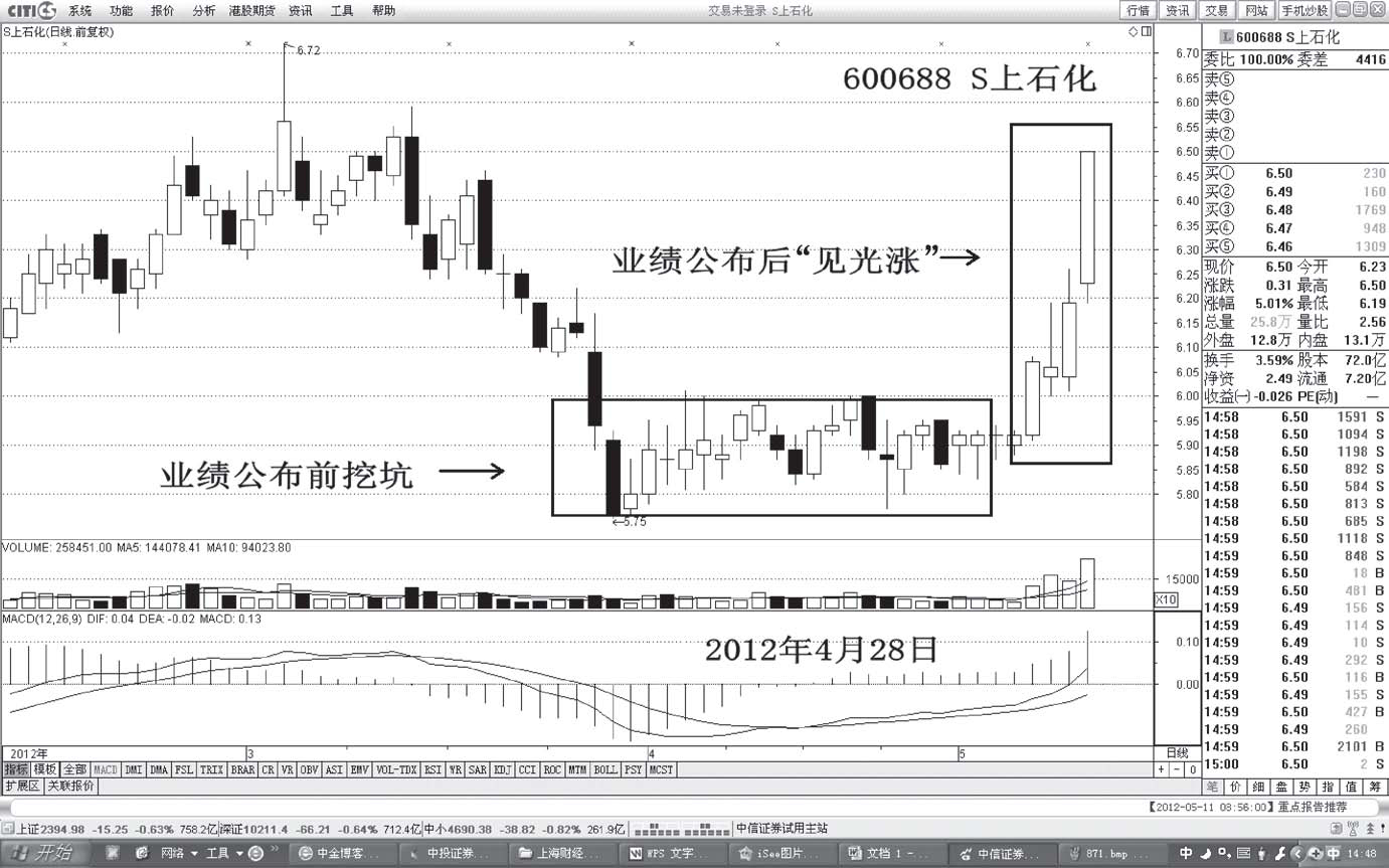出现“见光涨”的原因是主力通过内幕消息提前得知公司业绩情况,通过刻意砸盘、打压,挖出黄金坑,等待业绩公之于众便逆势拉升完成“虚晃一枪”;若是大幅亏损或者由盈转亏,那么股价通过前期的大幅回落实际上已经充分消化了利空影响,等待业绩利空公告反而形成“利空落地是利好”的效应。如果是由亏转盈或者大幅预增、大幅盈利,那么主力往往反其道而行之,制造反向挖坑打压股价,逢低吸纳廉价筹码,等待业绩公布于世,便是快速进攻的开始。