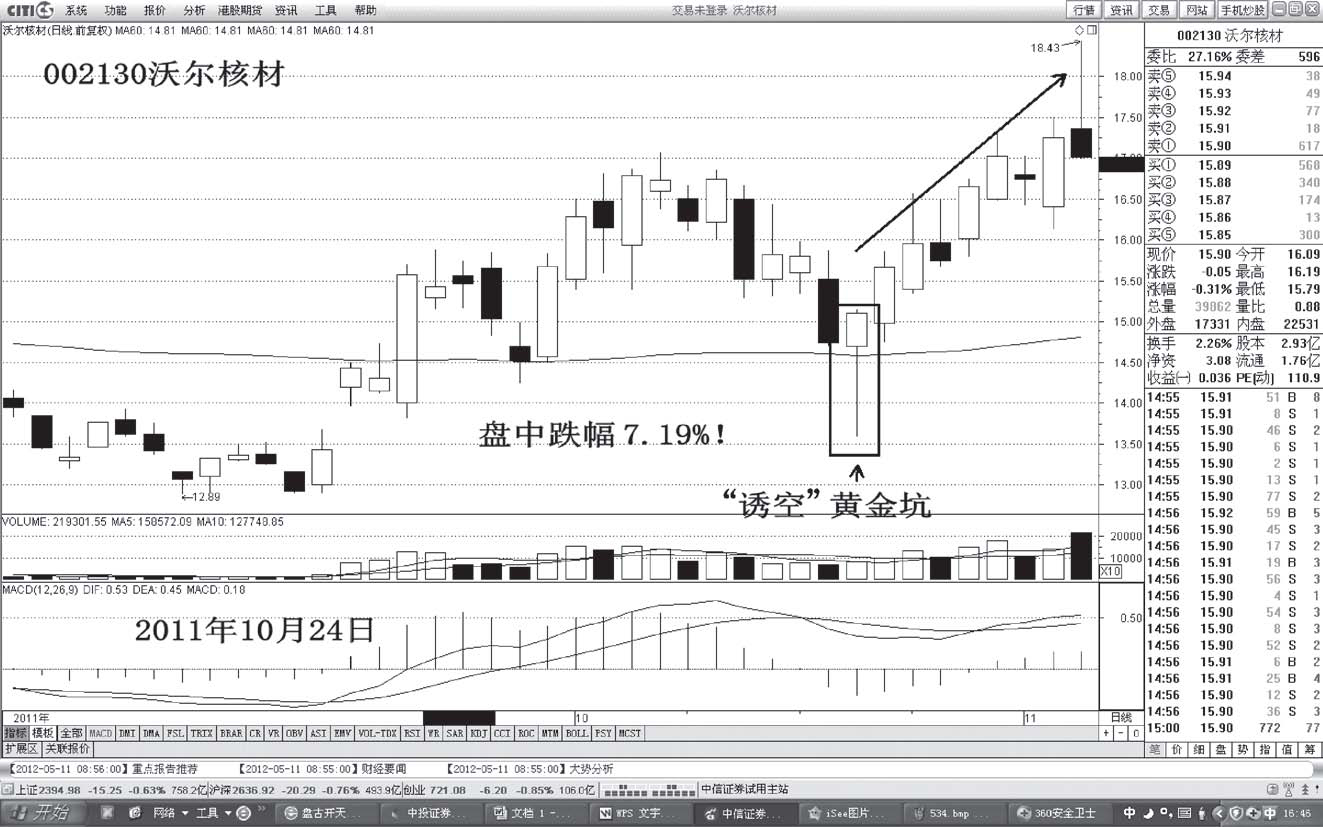 再比如002130沃尔核材在2011年10月24日盘中大幅下杀,跌幅达到7.19%,击破60日均线形成诱空,随后主力快速拉升把股价收回在60日均线之上,留下长长的下影线。从盘中放量情况来看,许多投资者被如此走势逼得割肉出局(见图2-15)。