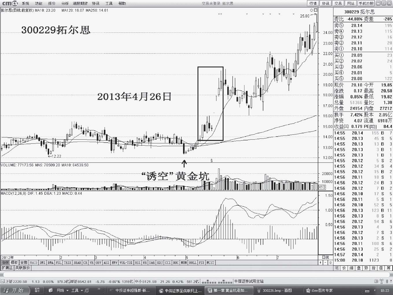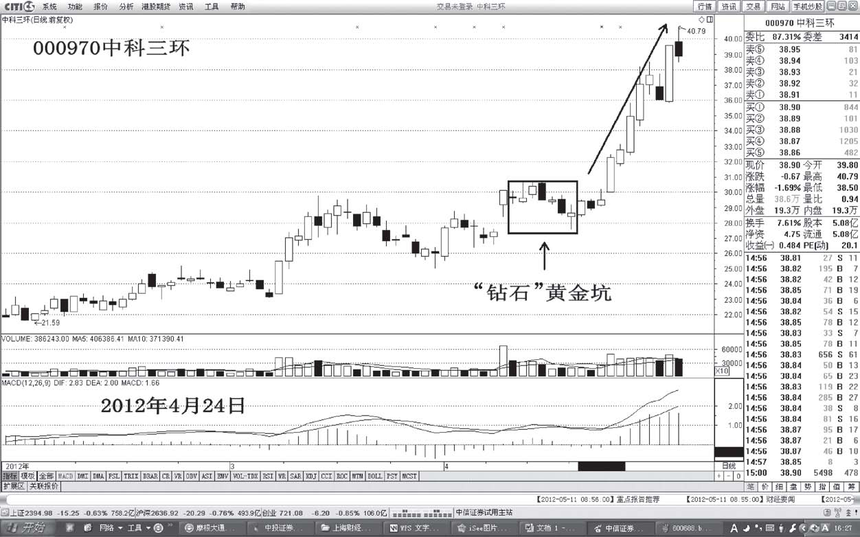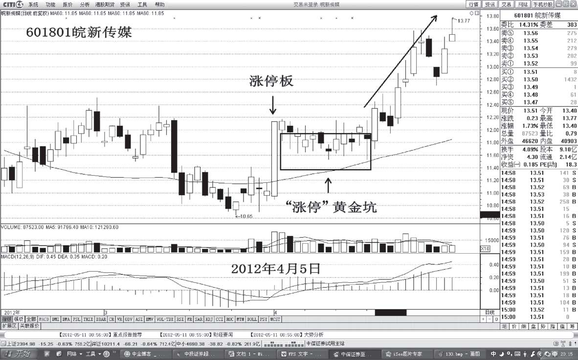 比如601801皖新传媒在2012年4月5日拉出第一个涨停板后,股价出现了长达12天的挖坑。并在4月24日挖坑至60日均线后,开始了一波大幅上涨行情。这个坑就是一个典型的“涨停”黄金坑(见图2-16)。