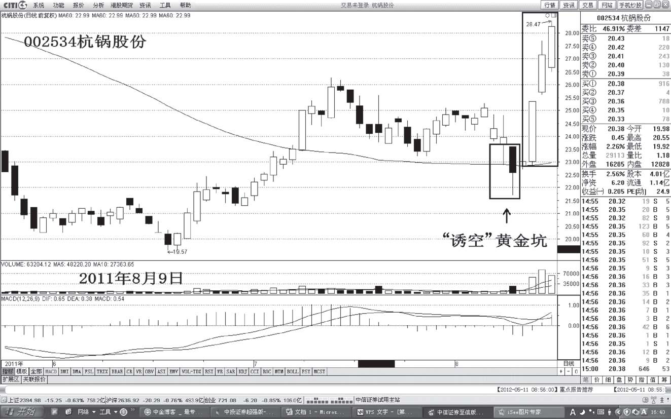 比如300229拓尔思在2013年4月26日盘中大幅下杀6.69%击破重要的年线,使得投资者恐慌抛售、割肉出局;其后主力展开大幅拉升行情(见图2-13)。比如002534杭锅股份在2011年8月9日主力凶狠地向下砸盘,盘中杀出-7.05%大阴线,击破重要的60日中期均线,形成大幅破位之势,逼迫投资者看空后市,割肉出局。随后8月11日主力突然反身向上迅速拉出涨停板,“诱空”黄金坑成立(见图2-14)。