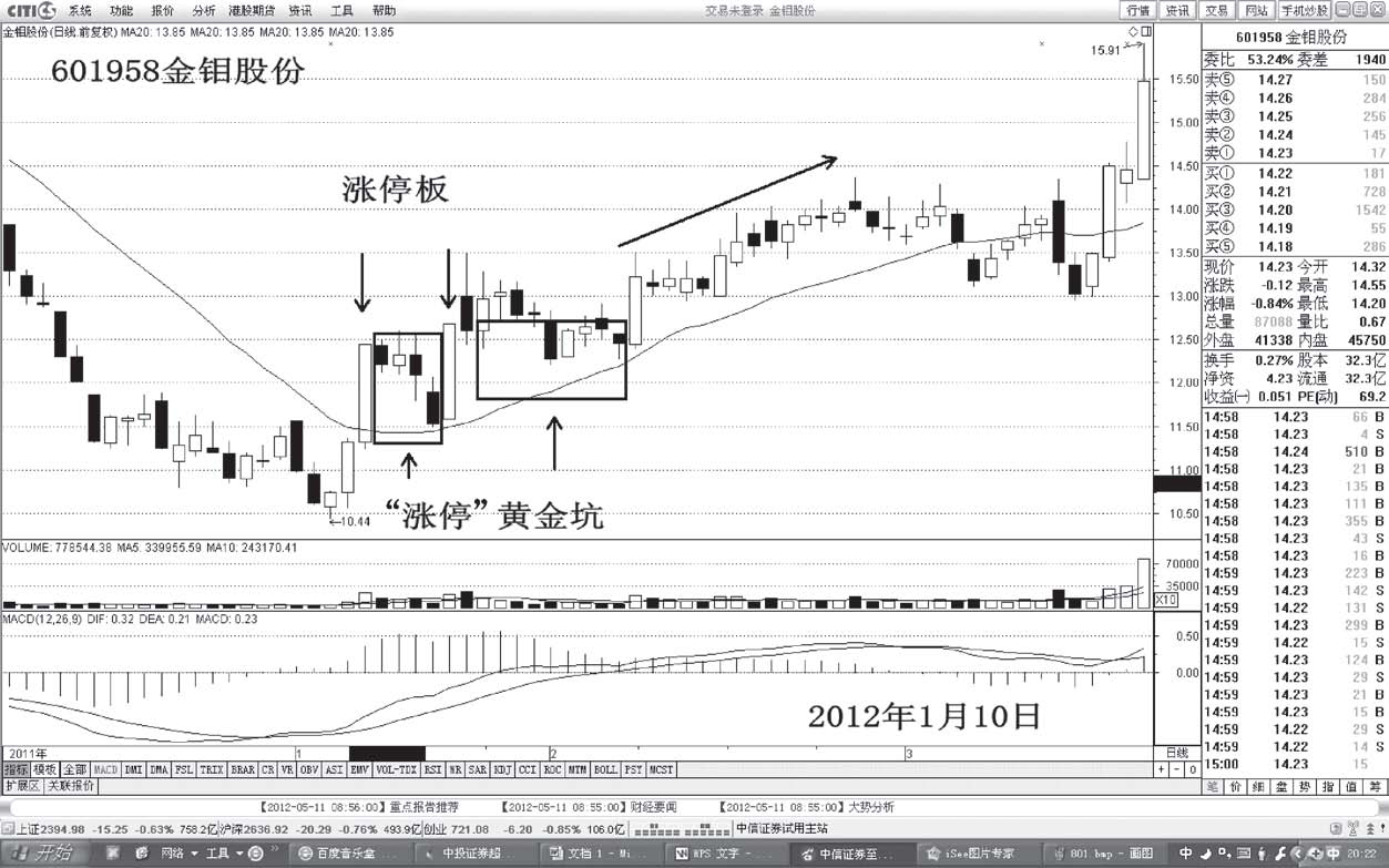 比如601958金钼股份在2012年1月10日及1月17日两次拉出涨停板后,都出现了主力的挖坑行为(见图2-17)。因此,等待主力拉出涨停板对于投资者而言就是引蛇出洞,等待主力向下挖坑采取行动就是后发制人。