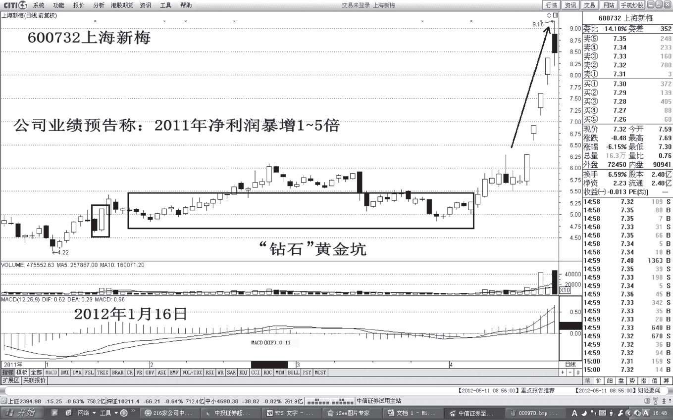 比如600732上海新梅2011年1月13日发布业绩预告公告称,公司预计2011年净利润同比增长1~5倍。消息公布当天股价封上涨停板。但是随后股价经过震荡、挖坑形成双底后,4月初股价开始向上爆发,短期涨幅达到83%(见图2-12)!