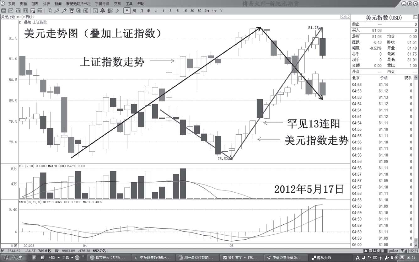 比如2012年5月1日美元开始出现超强走势,并且收出了罕见的13连阳线,对A股市场形成很大的冲击及产生负面效应(见图2-31与图2-32)。