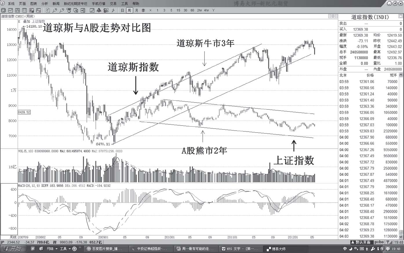 由此得出中国股市不是宏观经济的晴雨表,甚至与宏观经济晴雨表背道而驰!其原因是中国股市依然停留于政策市、货币市、融资市、投机市。下面通过一张道琼斯指数与A股走势对比图即可清晰看出两个不同性质的市场(见图2-33)。