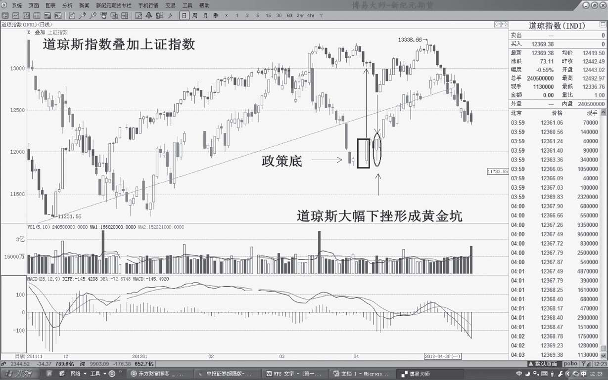可见政策性底部已经出现,中阳线意味着波段趋势性逆转的到来,短期产生技术性拐点。在此情况下,道琼斯指数的下跌往往会在A股砸出黄金坑。2012年4月10日道琼斯大幅下挫213点,A股大幅低开探底后便展开逆势上攻,收出大阳线,因此,当日低开下探形成的黄金坑是非常好的潜伏机会。