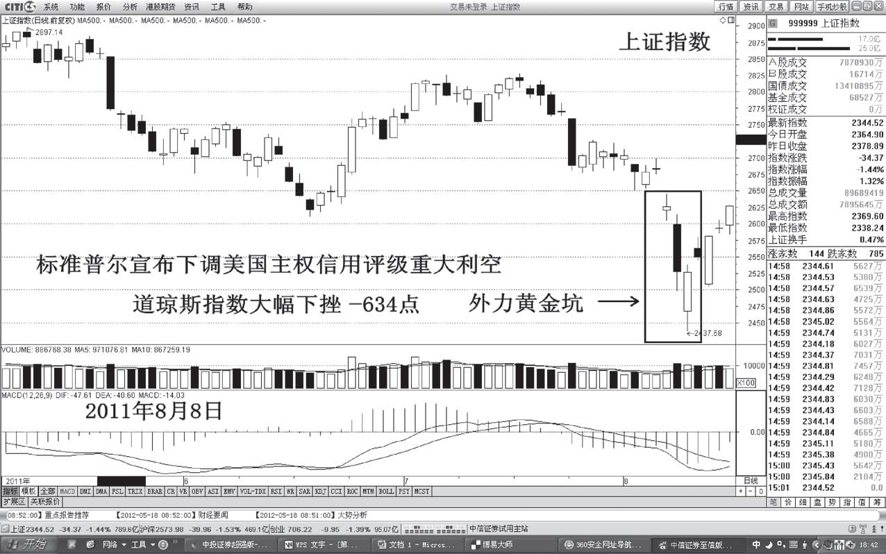 案例三:2011年8月8日受国际三大评级公司之一标准普尔宣布下调美国主权信用评级,由“AAA”调降到“AA+”影响,道琼斯指数大幅下挫634点,以色列股市就因此跌过6%而停止交易。A股市场同样不能幸免,大幅下跌近100点(见图2-36)。