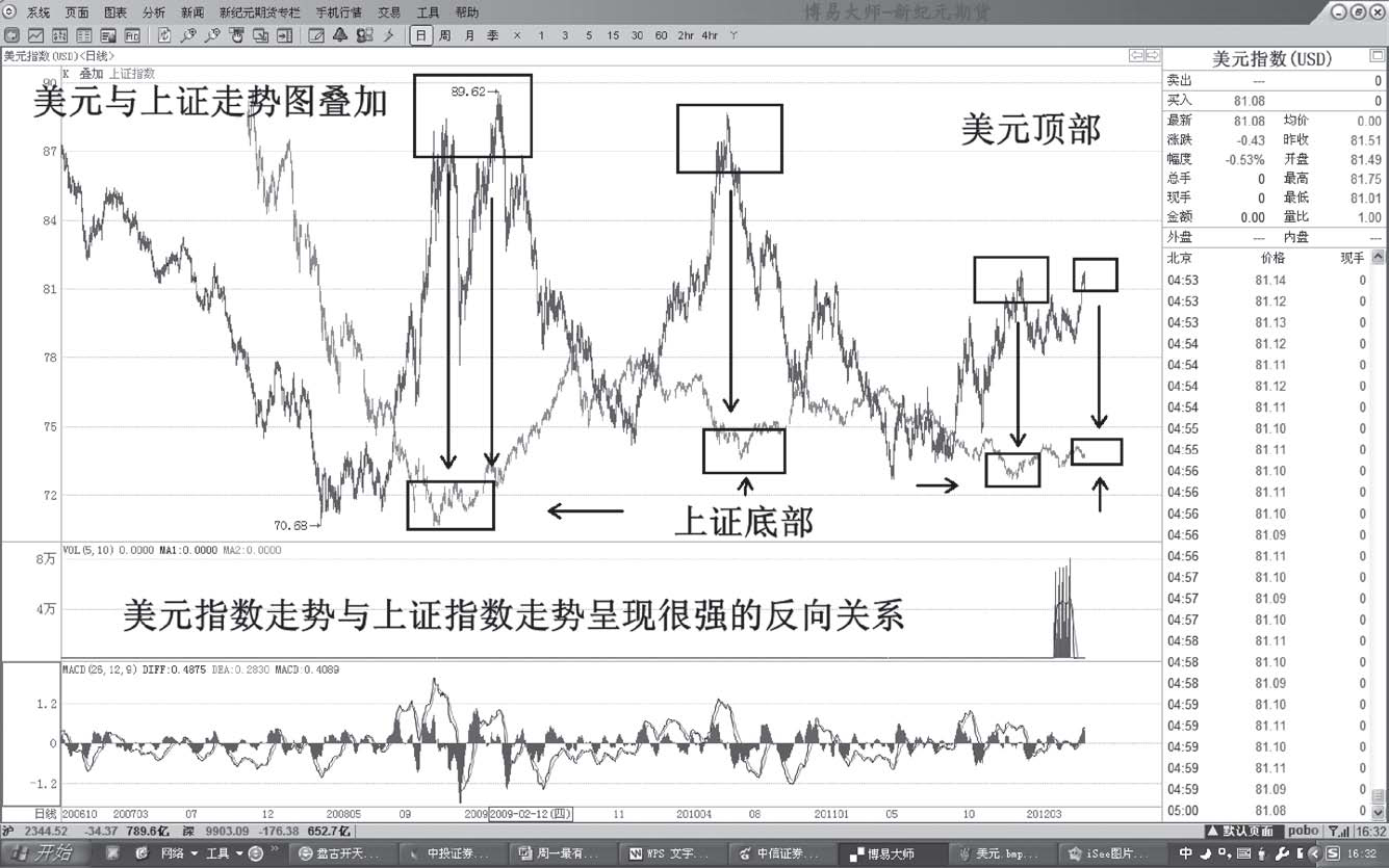 在此期间,相对于人民币而言,上证指数基本上随着汇率的涨跌而波动;但相对于美元指数而言,上证指数的走势就开始变成它的反向指标。因此,鉴于人民币与美元的特殊关系,实战中投资者可以把美元指数当作一种反映大盘走势的重要参考指标。