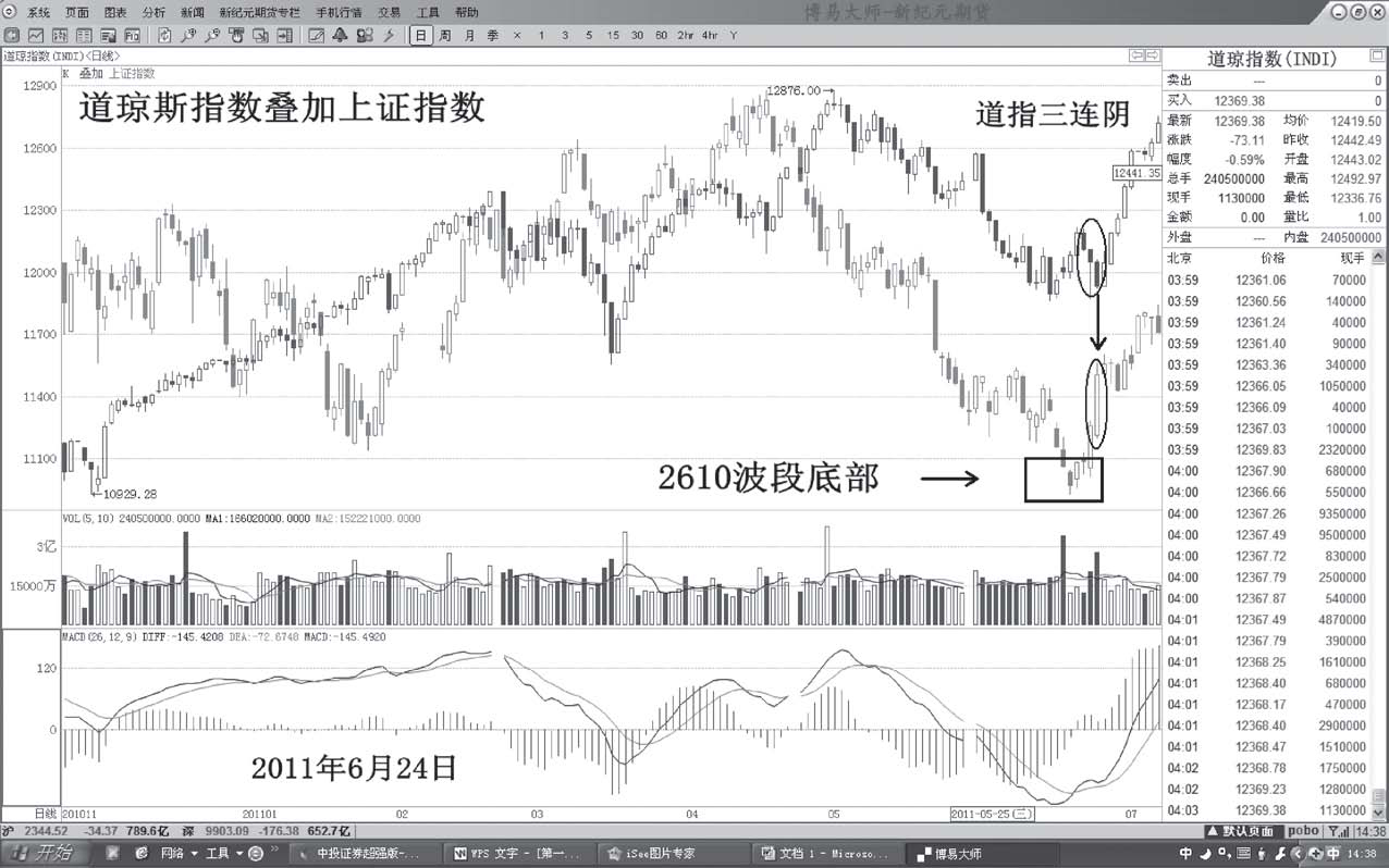 案例二:A股在2011年6月15日经过四连阴的杀跌,于6月23日产生一根中阳线,宣告短期波段技术性拐点的来临。而2011年6月24日道琼斯指数的三连阴使得A股低开形成盘中黄金坑,当日低开高走形成逆转走势。因此,当A股形成波段性底部后,若遭到外力打击往往是潜伏黄金坑的契机(见图2-35)。