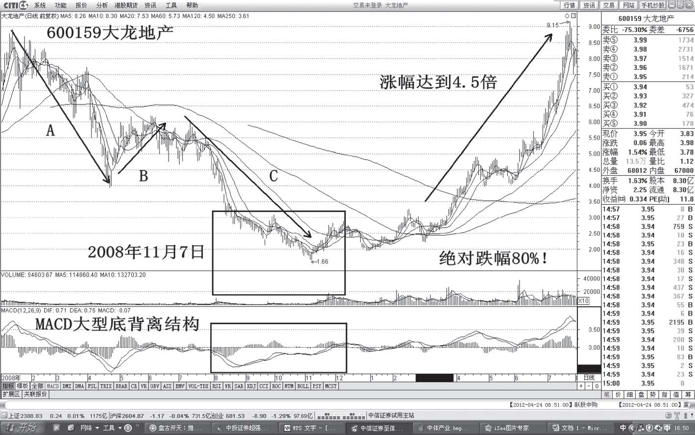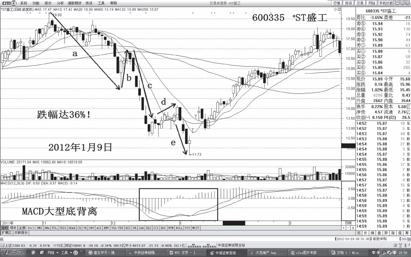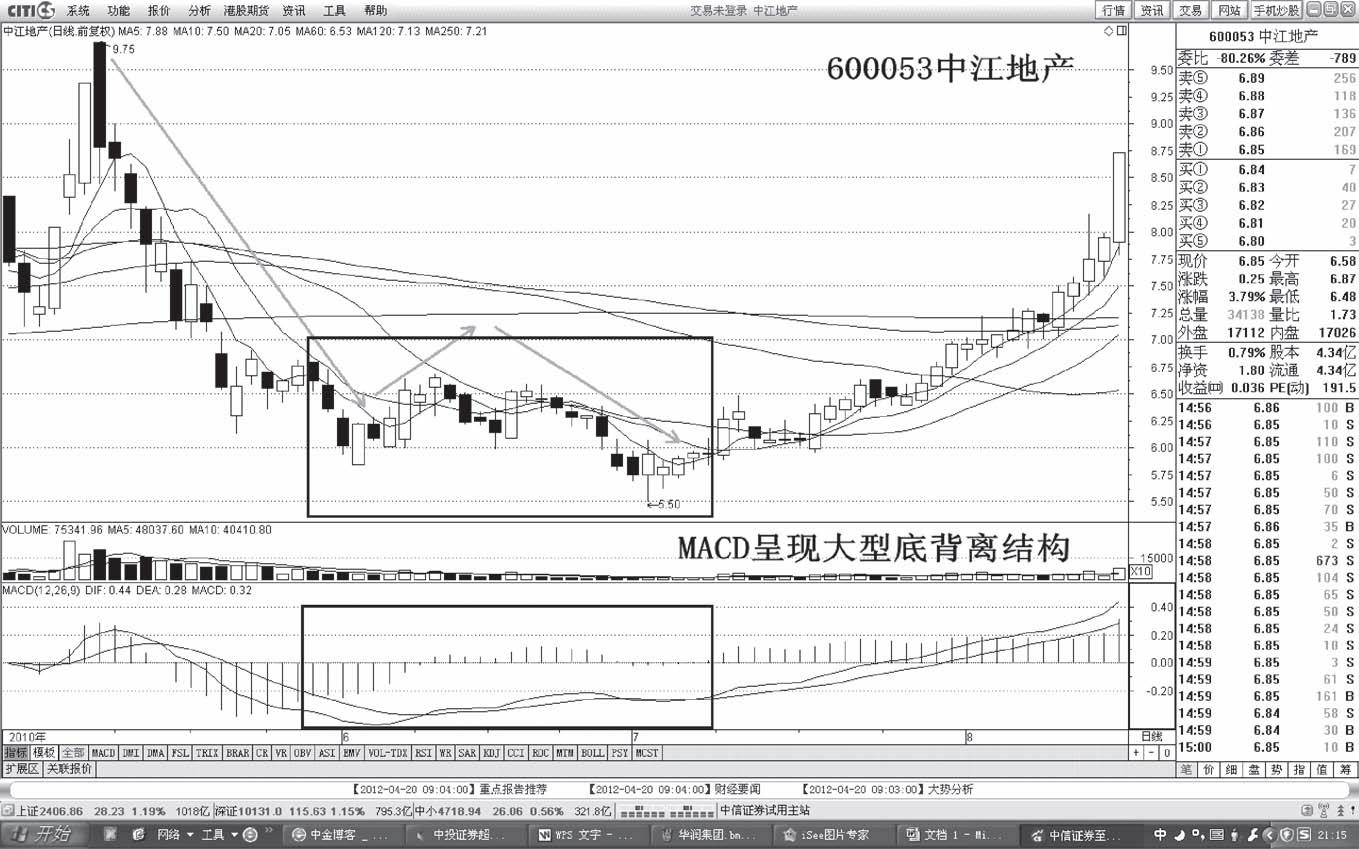 分析:股价自2011年11月3日展开五浪式调整,跌幅达到36%。MACD呈现出大型底背离结构。公司具有重组概念、扭亏概念,加上股价的大幅下挫形成超跌,吸引主力入场炒作(见图1-74)。