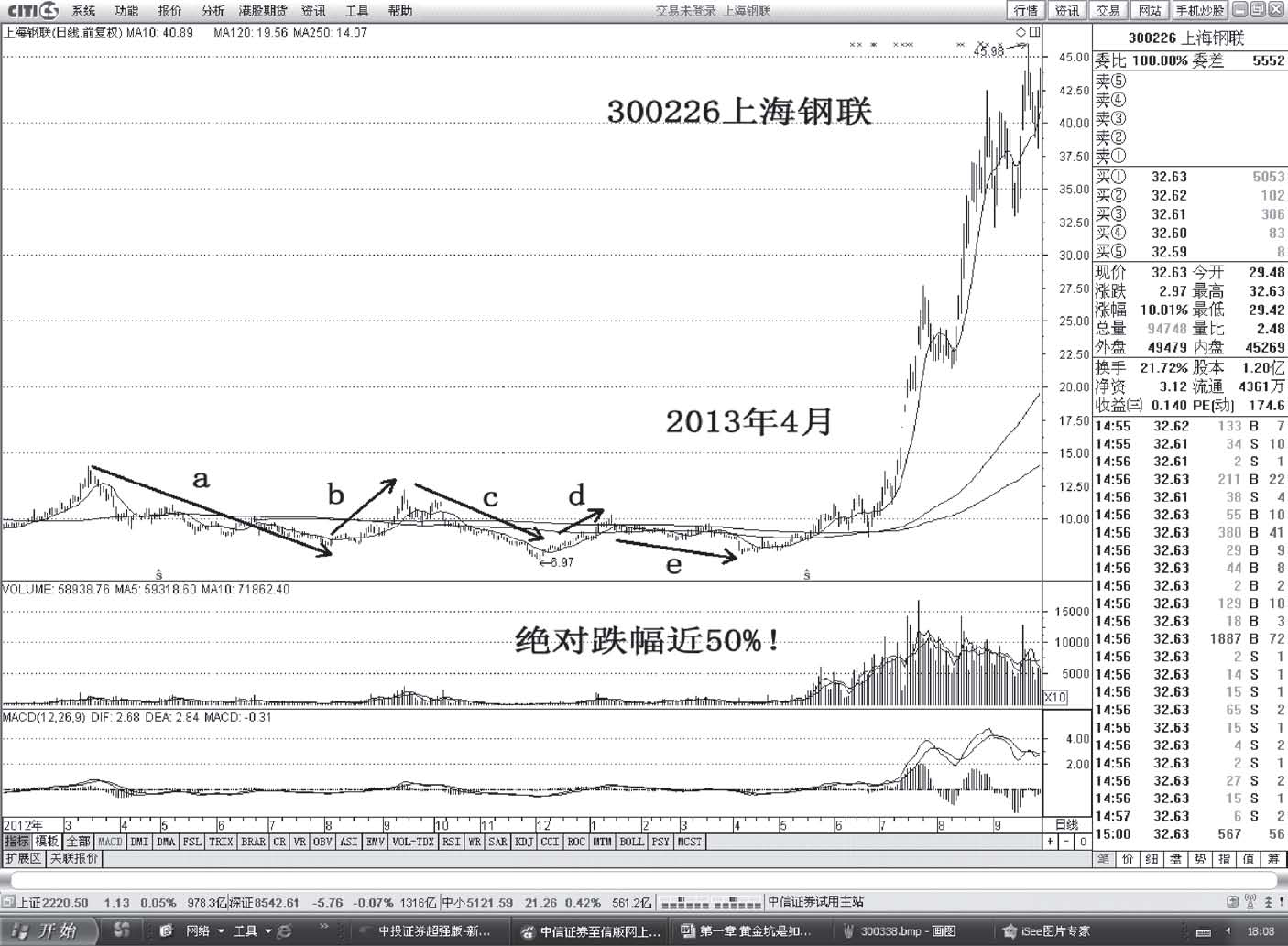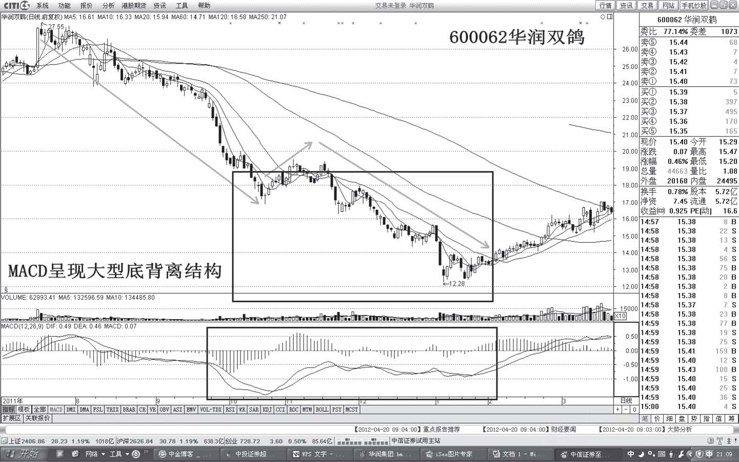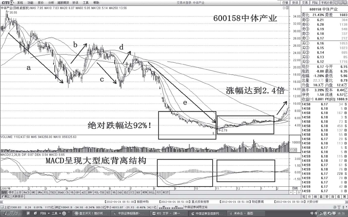 分析:股价自2011年11月3日展开五浪式调整,跌幅达到36%。MACD呈现出大型底背离结构。公司具有重组概念、扭亏概念,加上股价的大幅下挫形成超跌,吸引主力入场炒作(见图1-74)。