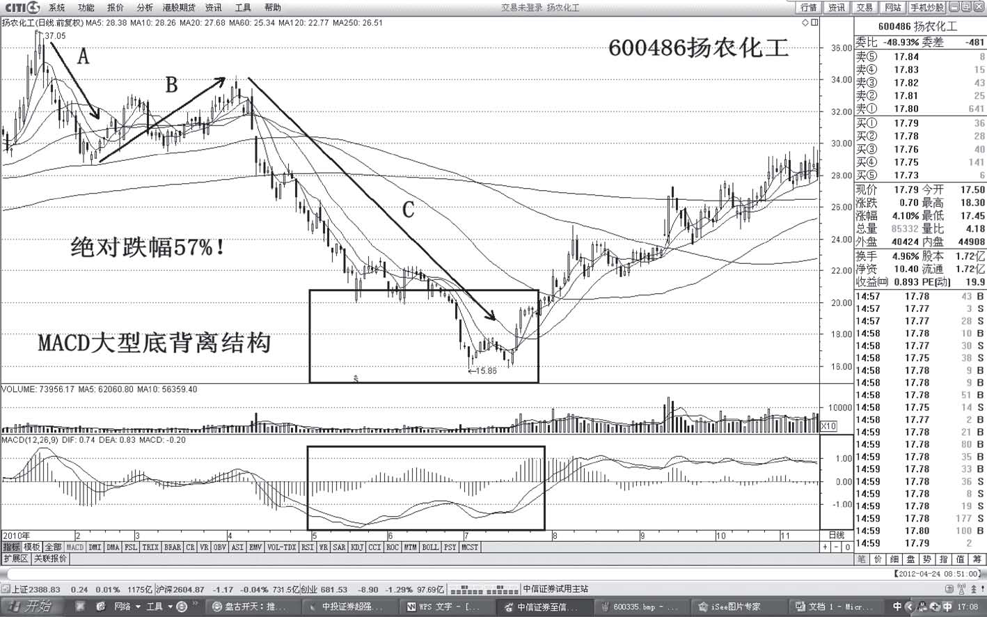分析:股价自2010年1月18日37.05元开始展开大三浪式调整,MACD呈现大型底背离结构。至2010年7月2日的15.86元,跌幅达到57%。公司具有农业概念,属于基金重仓股,巨大的跌幅吸引主力入场展开大幅操作(见图1-75)。