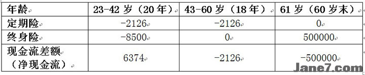 我们先假设体检结果优,定期寿险保费为2126元/年。如果小A在60岁(含)以前死亡或者患重疾,无疑是定期首先比较便宜。那如果不幸61岁死亡祸患重疾的话,显然定期险是不能获赔的,而终身险则可以在61岁时获得50万的保险。定期险和终生险的现金流比较如下表(其中,支付保费是现金流出,是负数;或得保额是现金流入,是正数):