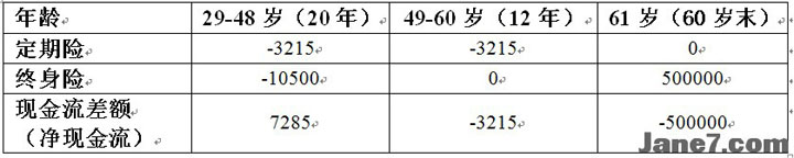 同样假设体检结果优,定期寿险保费为3215元/年。如果小B在60岁(含)以前死亡或者患重疾,无疑是定期首先比较便宜。那如果不幸61岁死亡祸患重疾的话,显然定期险是不能获赔的,而终身险则可以在61岁时获得50万的保险。定期险和终生险的现金流比较如下表(其中,支付保费是现金流出,是负数;或得保额是现金流入,是正数):