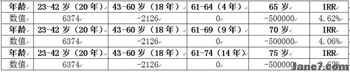 而如果小A不是在61岁(60岁末)死亡或患重疾更晚,比如65岁、70岁或者更晚,那么小A如果购买终身险后得到50万保费就会更晚,两者的净现金流的内部收益率更低,情况如下: