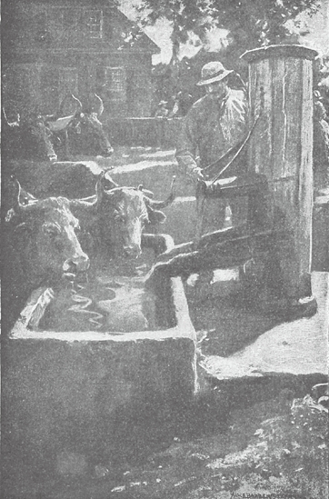 Your pardon, good people! I must interrupt my stream of eloquence and spout forth a stream of water to replenish the trough for this teamster and his two yoke of oxen, who have come from Topsfield, or somewhere along that way. No part of my business is pleasanter than the watering of cattle. Look! how rapidly they lower the water-mark on the sides of the trough, till their capacious stomachs are moistened with a gallon or two apiece, and they can afford time to breathe it in with sighs of calm enjoyment. Now they roll their quiet eyes around the brim of their monstrous drinking vessel. An ox is your true toper.