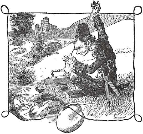 9. It would have been all over with her also, if, by good fortune, a tailor who was traveling in search of work had not sat down to rest by the brook. Pitying the poor bean, he pulled out his needle and thread and sewed her together. She thanked him prettily, but, as the tailor used black thread, beans since then have a black seam.