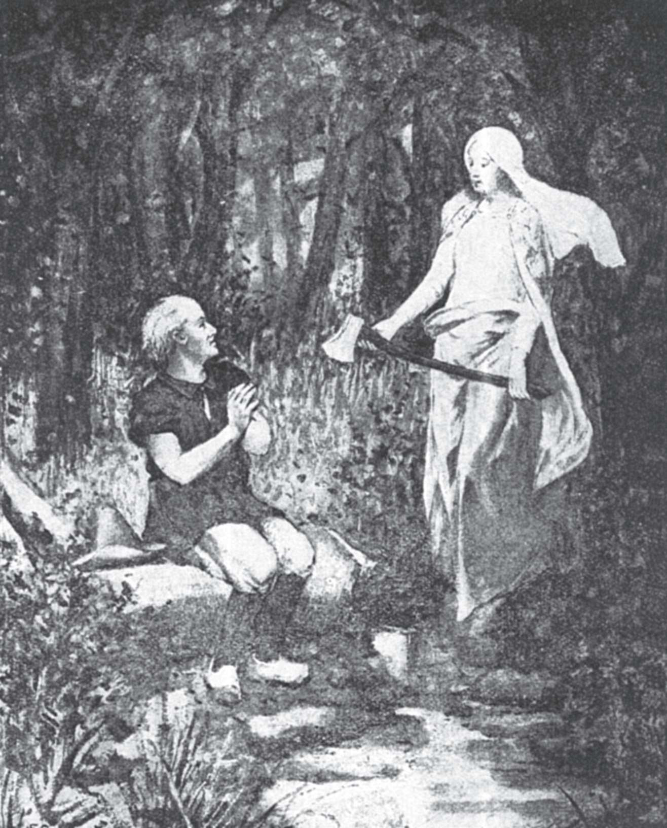 Then the fairy sank again in the water. The third time she came up, she brought the woodman’s ax in her arms.