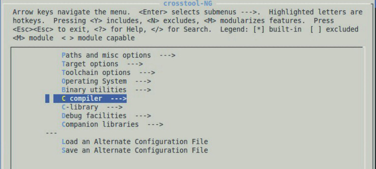 建立交叉工具链的过程相当烦琐,一般可以通过类似crosstool-ng这样的工具来做。crosstool-ng也采用了与内核相似的menuconfig配置方法。在官网 http://www.crosstool-ng.org/ 上下载crosstool-ng的源代码并编译安装后,运行ct-ng menuconfig,会出现如图3.12的配置菜单。在里面我们可以选择目标机处理器型号,支持的内核版本号等。