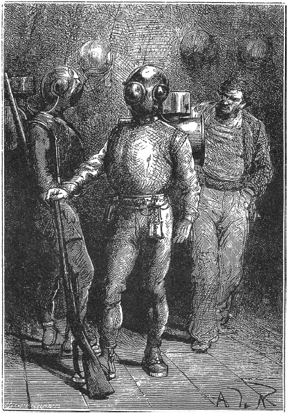 我腰上挂着鲁姆科尔夫灯,手里握着猎枪,只等出发。可是,坦率地说,身子被“囚”在那身沉重的衣服里,脚被那双铅底鞋“钉”在甲板上,我是寸步难移!