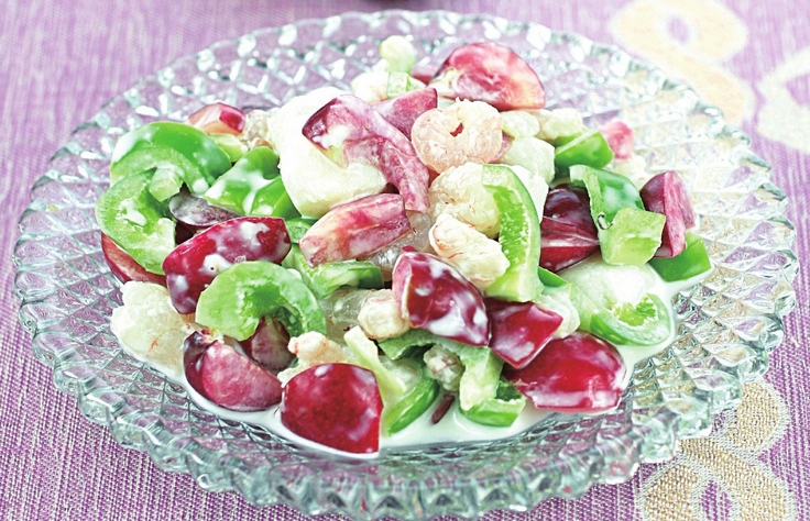 2 将所有处理好的材料装盘,倒入柠檬沙拉酱,拌匀即可。