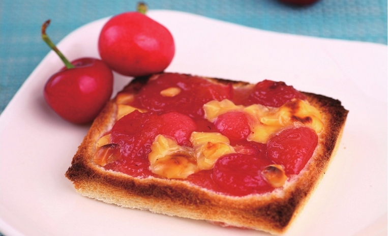 2 将樱桃酱均匀地抹在吐司面包片上,撒上奶酪丁。