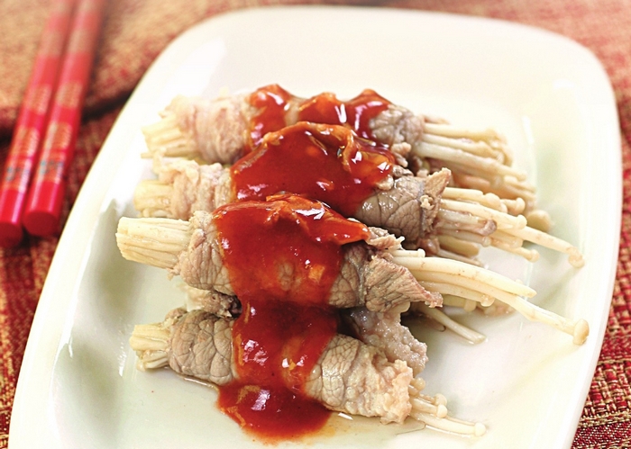 2 将肥牛片理平于案板上,放上一小摄金针菇,卷起后用牙签固定,即成肥牛卷生坯,逐一下入沸水中焯熟,去掉牙签,整齐地摆在盘中。
