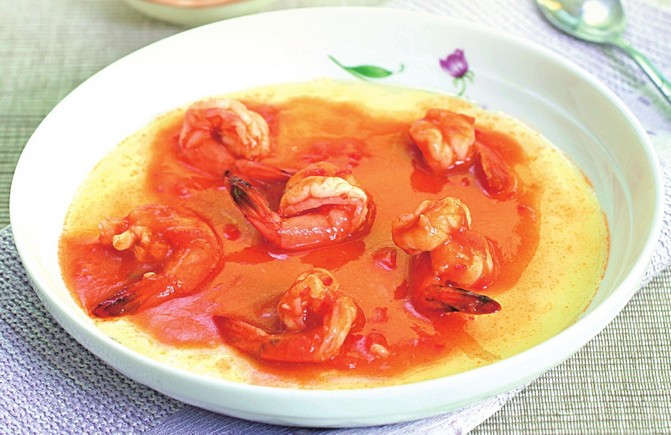 蛋羹滑嫩,虾肉脆嫩,茄汁红亮,微酸甜带咸。此菜可补充优质蛋白,虾又是高钙食品,是改善营养、强健骨骼的佳品。