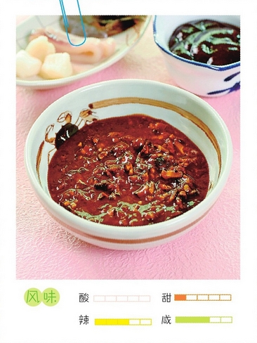 2 炒锅上火,放适量油烧热,下海米、干贝蓉炒干水汽,再下泡辣椒蓉炒出红油,加鲜汤烧滚,加入姜汁、蒜汁、白糖、白醋、盐、鸡精和海鲜酱炒匀,淋香油,盛出。