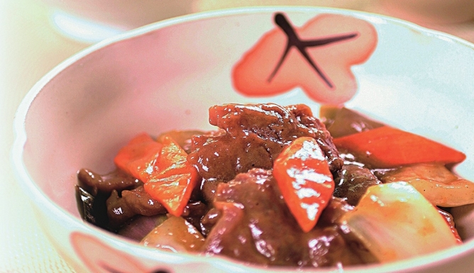 本菜牛肉滑嫩,咖喱味独特。牛肉与胡萝卜、洋葱不仅在口味上是最佳搭配,在营养上也有很好的互补作用,且有利于吸收。