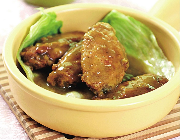 3 锅留底油上火烧热,下葱段、姜片炸香捞出,再下咖喱酱炒香,加适量水,放盐、鸡精调味,放入煎好的翅中,以小火烧煮至汁浓稠时,淋香油,出锅装盘。