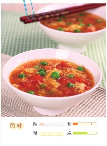 2 炒锅上火,放适量油烧至六成热,放葱花炝锅,倒酱油和水烧开,放番茄、豌豆煮至番茄变软、汤变红,加白糖、盐、鸡精、胡椒粉调味,勾浓芡汁,浇入鸡蛋液,开锅后鸡蛋浮起大片时即可出锅。